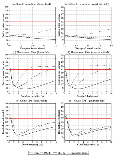 The range of the specific filter parameter for Gaussian mean filtering was from 1 to for the linear fields and from to for the quadratic fields as depicted in Figure 7b,b1 with overall filtering parameter . The corresponding strain fields (Figure 8b), for and show less error compared to simple mean filtering and Gaussian LPF, except for the quadratic field when was applied. Applying , Gaussian mean filtering reconstructed the linear fields with error reduction of 45, 74 and , and the quadratic fields with error reduction of 37, 72 and for the different sizes of the strain windows.