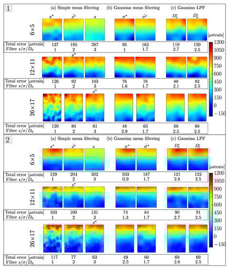 Gaussian LPF had between and for linear fields and between and for the quadratic fields; see Figure 7c,c1 with overall filtering parameter . Applying , Gaussian LPF reconstructed the linear fields with error reduction of , and , and the quadratic fields with error reduction of , and for the different sizes of the strain windows. Figure 8 shows a 2D visualization of the filtered strain fields.