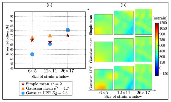 The application of , , and to the constant simulated strain fields are summarized in Figure 9, where the error reduction for different strain window sizes is shown. Regardless of the size of the strain windows, Gaussian mean filtering performs best (error reduction 73–81%) whereas for a window size of and , Gaussian LPF performs at least with error reduction of . For a window size of , all filters achieved a similar level of error reduction.