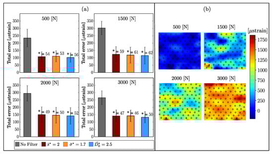 The overall optimal filters (, , ) were applied on the strain windows from the steel samples. The total error and the error reduction level are depicted in Figure 10a at four loading steps 500, 1500, 2000 and 3000 N load, Figure 10b shows the corresponding 2D interpolated strain fields overlaid with the discrete measurement points. The total error was reduced by 50% when applying the three overall optimal parameters, without any remarkable difference with regards to the load level.