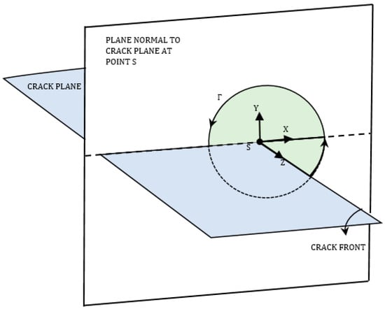 By assuming a planar crack surface, at any point of a 3D crack front, the J-integral can be defined locally varying along the crack front. The local value of the J-integral at any point of the crack front is given by Equation (1) [29], which is the sum of a line integral along a path and a surface integral in the domain:
