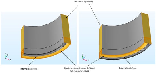 Using symmetry, the geometry is simplified by modelling on 1/4th of the pipe in the circumferential direction and half of the geometry in the longitudinal direction with the crack located at its centre. A symmetry condition was applied from the crack tip to the inner or outer boundary of the pipe depending on the crack location to demonstrate a crack-like effect when a load is applied. The total length of the pipe was chosen to be 10 times the wall thickness to avoid any significant end-effects. Symmetric boundary conditions were applied such that the crack is set free and an internal or external crack is defined depending on what boundary is selected (as shown in Figure 3).