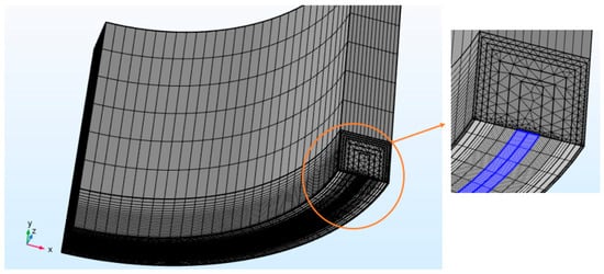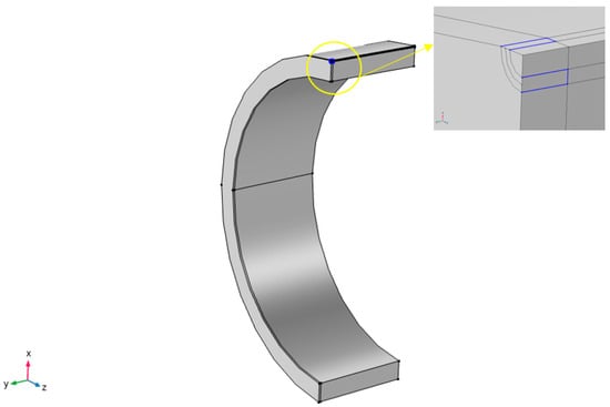 The Young’s modulus and Poisson’s ratio for the pipe material are chosen to be and , respectively. A 3D finite element mesh consisting of a total of 18,990 elements (16,650 prisms and 2340 hexahedra) was applied. A high level of mesh refinement is required around the crack region to enable accurate results from the deformed geometry (Figure 4). Based on the size of the first contour which is also used as a mesh partition, the minimum element size in this region was set to 0.25 mm.