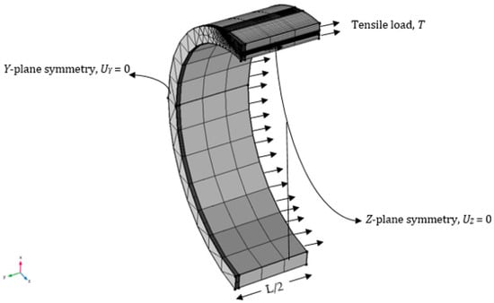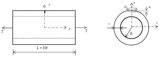 Figure 8 shows the circumferentially cracked pipe and crack dimensions subjected to a tensile load, with material properties Young’s modulus, and Poisson’s ratio, . The pipe material is made from API 5L Grade X65 steel, a material widely used for offshore oil and gas pipelines [30] with a yield strength, ultimate tensile strength and fracture toughness (KIc) of 450 MPa, 535 MPa and 280 MPa , respectively. The model is further simplified to effectively save computational time and memory. By applying symmetry, a quarter-pipe geometry is modelled through the sectioning of the pipe along its circumferential and longitudinal axes. The loading and boundary conditions were executed by applying symmetry on the boundary of the pipe containing the crack i.e., y = L/2, and the two cross-sectional faces normal to the z-axis. The length of the pipe in the present analysis is chosen as L = 5 × t, which is sufficient to capture the response discontinuity caused by the crack. A tensile load, T is applied at the free end of the pipe and a prescribed displacement constraint, is applied on a point at the bottom surface of the pipe to suppress rigid body motion.