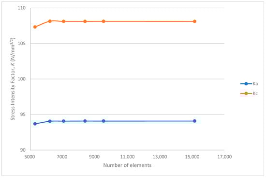 The corresponding stress intensity factors at the deepest point and surface of the crack were compared to previous work by [8,33]. For crack aspect ratio, a/c = 1, a maximum percentage error of 3.2% at the deepest point, and 3.9% at the surface point was observed when compared to the work of Bergman. In contrast, maximum discrepancies of 3.1% and 4.8% were observed at the deepest and surface points, respectively, when compared to the work of Hoh et al. For a/c = 0.5, differences of up to 2.4% and 12.3% were observed for deepest and surface points respectively when compared to Bergman’s work. However, when compared to the work of Hoh et al., discrepancies of up to 1.6% and 13% were observed in the deepest and surface points, respectively. Finally, for a/c = 0.25, errors up to 3.1% and 7% were observed in the deepest and surface points, respectively, when compared to Bergman’s work. In contrast, maximum discrepancies of 4.2% and 7.3% were observed in the deepest and surface points, respectively, when compared to the work of Hoh et al. It is clear from the analyses that the effects of stress and strain gradients become more significant in the surface integral calculation when the crack becomes steep and narrow, therefore, leading to a divergence in the stress intensity factor values at the surface point of the crack. The trend in the changes of stress intensity factor at the deepest point and surface point of the crack with respect to changing sizes is shown in Figure 13, Figure 14 and Figure 15.