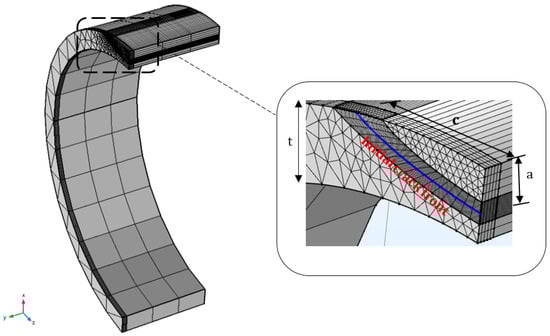 The J-integral is evaluated using the derivatives of the displacement field obtained from an arbitrary 2D domain bordering and perpendicular to the crack front as shown in Figure 9. The analysis by [8] used ABAQUS software [31], applying the domain integral method based on the formulation described by [32] to evaluate the J-integral, and defining the integration domain with rings of elements surrounding the nodes along the crack front from one crack face to the opposite crack face. This means that the J-integral can only be derived at the element nodes along the crack front. However, the method used in this work makes it possible to derive the J-integral on any point along the crack front. Eighteen different models with different crack sizes were studied to compare the current work with results presented in [8]. Three different crack aspect ratios, a/c equals 1, 0.5 and 0.25, and six different crack depth-to-thickness ratios (a/t) of 0.05, 0.1, 0.2, 0.3, 0.4 and 0.5 were evaluated. The model mesh is optimized to ensure efficiency in the computational analysis and correctly estimate the high stress/strain gradients in the critical parts of the model. Discretized with quadratic shape functions to give a better representation of the curved crack geometry, the completed mesh for the largest crack size consists of 17,862 elements including 9022 prisms and 8840 hexahedra. The application of a coarse mesh in the regions of less interest reduces the computational requirements of the model without significantly influencing the accuracy of the results as demonstrated in Figure 10 and Figure 11. However, high level of mesh refinement (Figure 12) is applied in the crack region of the pipe to obtain accurate J-integral and corresponding stress intensity factor values from the deformed crack shape.