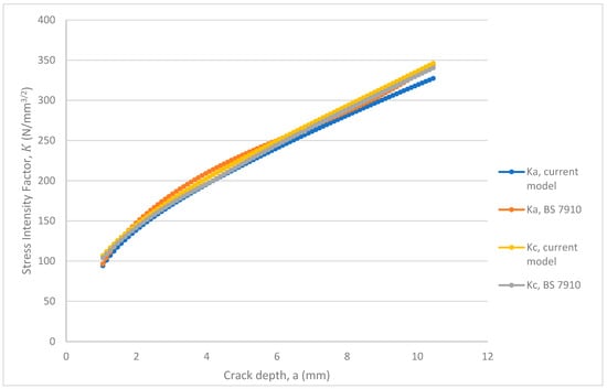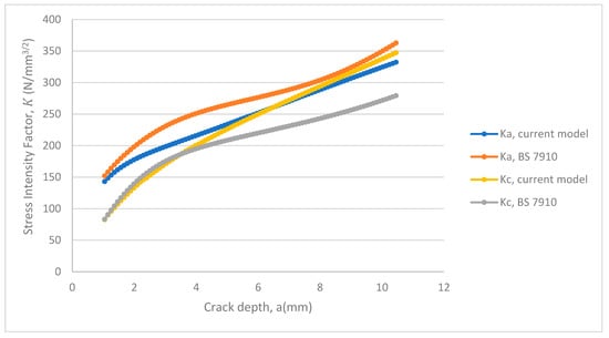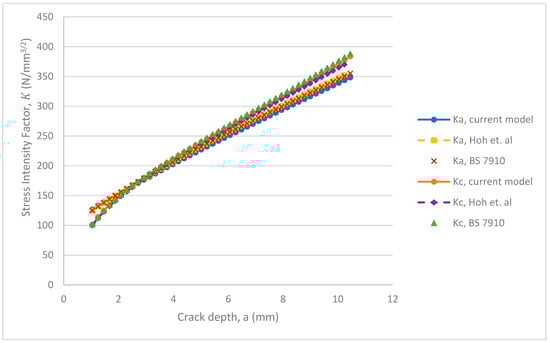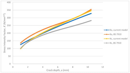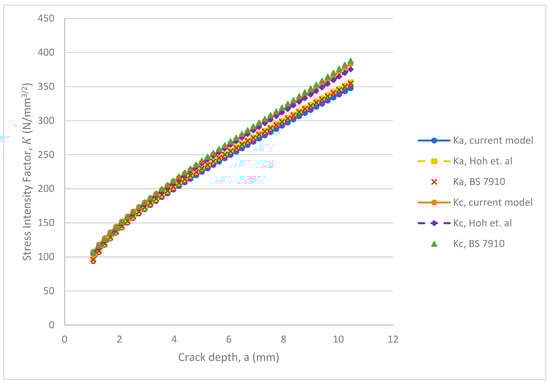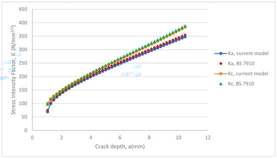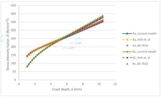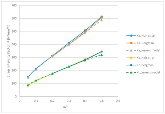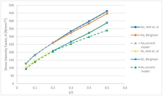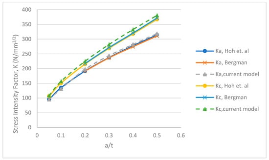 - The stress intensity factors, K, for a surface crack are estimated using Equations (2)–(4) at the deepest point Ka and at the crack surface Kc. The validation of the current method uses the pipe geometry in Figure 9.
