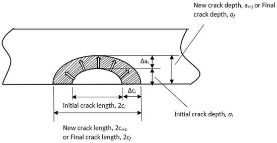 - The crack geometry and shape are updated for the next propagation step by adding Δai and Δci to ai and 2ci, respectively.