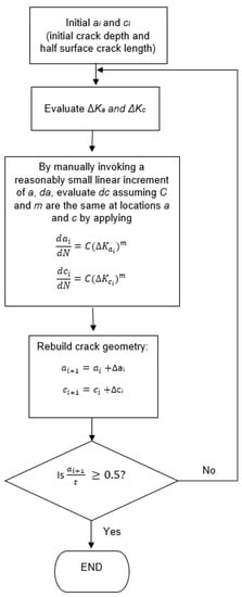 where da is the change in crack depth, dc is the change in crack surface length, dN is the change in the number of cycles, C and m are material properties given as and , respectively [3], and is the change in stress intensity factor defined by Equation (8):