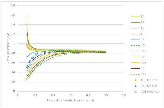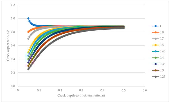 Figure 18 shows the predicted fatigue crack growth pattern for a set of surface cracks subjected to tension. The curves demonstrate the change in aspect ratio as the crack grows from an initial size to a final size, in this case the mid-thickness of the pipe. The initial geometries of the cracks are defined by and with the values of swept from 0.05 to 0.5, while the values are chosen as .
