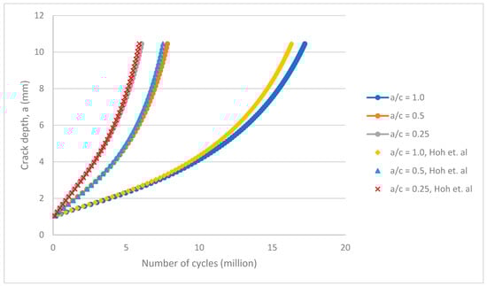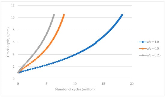 where is the number of load cycles required to grow a crack from an initial crack depth, (ai) to a larger crack size ai > ai+1. Unstable crack growth and fracture eventually occurs when the crack depth reaches a critical value (ac) and Kmax = KIc; Y is the dimensionless shape factor related to the crack size; is the cyclic stress range. The integral in Equation (9) is solved numerically because Y is also dependent on the crack size. It should be noted that a maximum crack depth of was chosen in this paper to enable direct comparison of stable crack growth with other researchers.