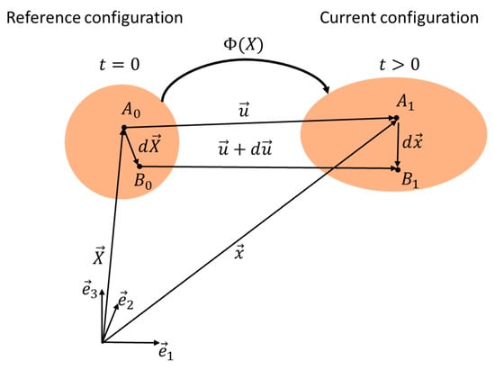 describes the trajectory of material points in the coordinate system . It is a continuous, bijective function and, therefore, has an inverse . The latter ensures the mapping of the material points from the reference to the current configuration and vice versa. The Equation of motion and its inverse take the following form [,]: