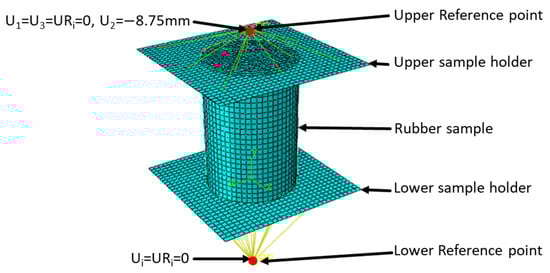A static finite element analysis was carried out. A 1 mm long element edge of type C3D8H mesh was used to mesh the sample. This type of finite element mesh is widely used for incompressible material behavior. The boundary conditions were defined at the reference point of the lower sample holders. At this point, all degrees of freedom were prevented. At the reference point of the upper sample holder, the displacement in the load direction was specified. The rotations and the remaining displacement degrees of freedom were prevented. Figure 2 shows a schematic diagram of the finite element model used during the FEM simulation highlighting the sample geometry and the boundary condition.