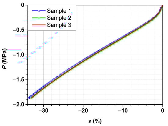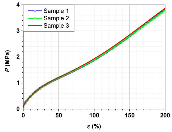 To check these findings, three stress–strain curves in compression mode for SBR filled with 70 phr carbon black N234 are performed. The test results are shown in Figure 6.