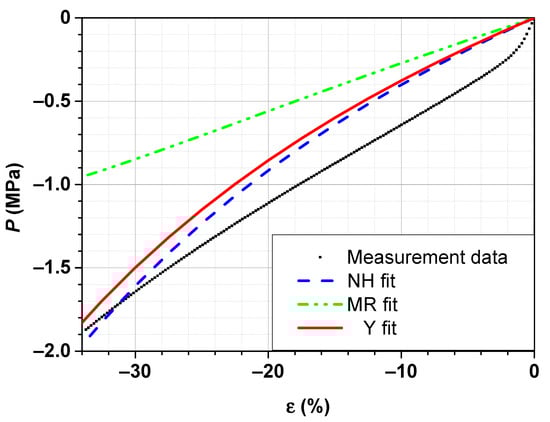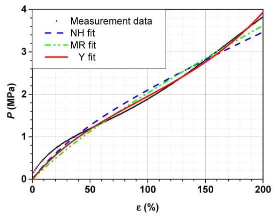 Figure 7 illustrates a representative stress–strain curve of the SBR sample in compression mode and the corresponding simulated curves using the neo-Hooke, Mooney–Rivlin and Yeoh models derived from measurement data in tensile.