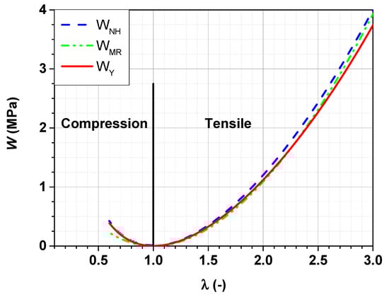The material constants , and are used to calculate the strain energy density function according to Equations (18), (20) and (22) for neo-Hooke, Mooney–Rivlin and Yeoh materials respectively. The strain energy density function as a function of the principal stretch ratio for the uniaxial tension and compression deformation state is plotted in Figure 5.
