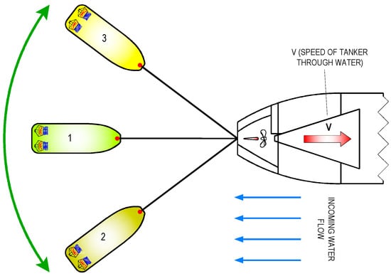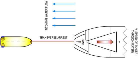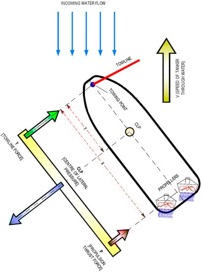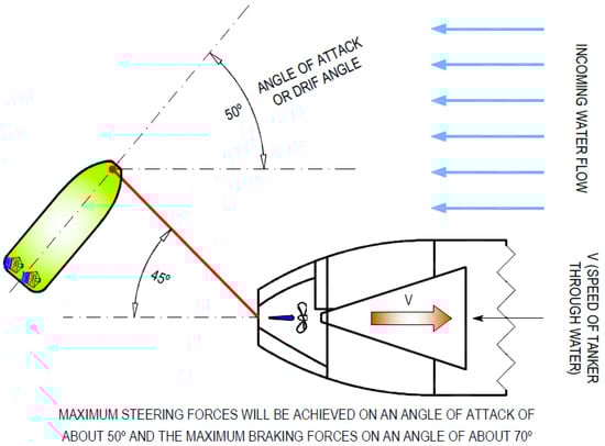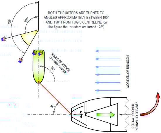 From an operational point of view, turning the tanker in the most suitable direction is the quickest way to control it, provided that there is sufficient sea room, because its speed is reduced very quickly in this case []. This is the reason why the capability of an escort tug to generate maximum steering force is essential. However, the escort tug’s capability to apply maximum braking force becomes necessary in restricted waters when there is not enough room to turn the tanker; therefore, its performance in applying this force in this condition is also important. As a typical escort towing speed is about ten knots, when an emergency occurs, an indirect mode is used first, and as speed is reduced, the escort tug will change to direct mode.