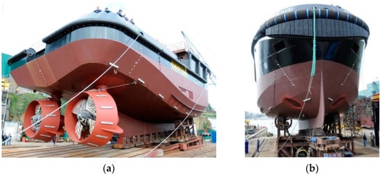 Figure 3. (a,b) The ASD escort tug “Costante Neri” delivered in September 2009 by Gondán Shipyard, S.A. (Spain), to the owner Fratelli Neri S.p.A. (Italy). Photo: Authors. - Increase directional stability.