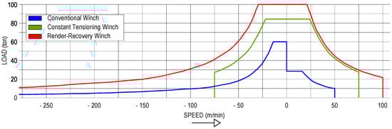 To achieve this goal, the so-called “symmetrical” render and recover capability had to be overcome, because the significant power required in dynamic braking or load attenuation is much higher than the inherent haul-in power limits of a typical render–recovery winch drive []. As the braking power was not enough to cope with the high peak loads that can be generated in these conditions, other sophisticated means had to be provided.
