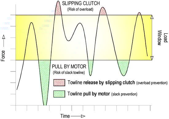 Typical towline load variations and SafeWinch behavior in dynamic conditions []. Drawing: Authors.