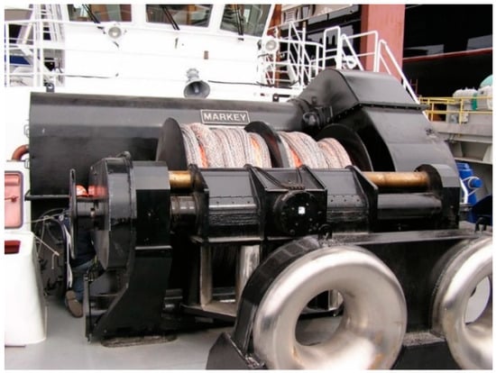 Regarding the effective performance of these winches in dynamic environments and without the master actively involved, a safe load control system is vital to achieve an optimum operation because simply assembling their sophisticated components (the clutches, the brakes, the gear train and the large variable frequency electric motors) is not enough []. As the adjustments would be almost impossible to achieve by the most trained skipper using hand lever controls, to handle the towline’s constant tension automatically (within the limitations of the winch), very sophisticated software and programing are needed in order to achieve closed loop monitoring and a proportional-integral-derivative (PID) control system [].