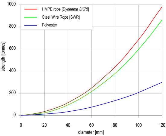 Although there are small differences among various ropes manufactured depending on their fibers—mainly Spectra® (Honeywell, New York, NY, USA) or Dyneema® (DSM Dyneema B.V., Geleen, The Netherlands)—and how rope manufacturers feature these fibers in their ropes, they have a similar strength to wire rope at the same sizes, but only around 1/6th of the weight, which simplifies their handling. It also floats (enabling tug operations to be much simpler and safer). However, it should be taken into account that if jacketed, they can have a higher density and may sink, depending on the rope’s diameter and the material the jacket is made of [] (p. 9).