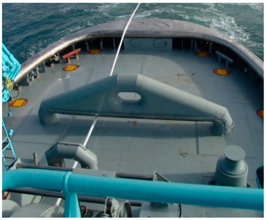 - Proper deck hardware: To minimize unnecessary abrasion damage, all surfaces in contact with the towline should be smooth (it is recommended to be kept at a maximum roughness of 250 microinches, μ”). Typically, on board the tug, this is achieved by well-designed stainless steel staple and bitts being highly polished (Figure 11) and with a generous bend radius—ideally, the cap rail should be made of stainless steel as well []. As the towline leads from the winch drum to the staple and then directly to the tanker, a point of fatigue is generated at the staple, which is exacerbated by the back-and-forth tug motions, which is the reason why water spray cooling is recommendable to dissipate heat due to the friction there [] (Figure 13).