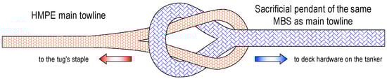However, the main source of abrasion leading to failure in the towline, an Achilles’ heel as Arie [] metaphorically describes, is when it comes into contact with poor fittings (chocks and bitts) on the tanker [] (p. 5). A good example to follow in order to tackle this drawback is the tanker–escort tug system implemented in Prince William Sound, where tanker fittings should be designed according to the towline force capability of escort tugs deployed there [,]. To minimize this potential damage and extend the life of the main towline, a sacrificial pennant—sometimes referred to as pendant or forerunner (a short length of HMPE rope with an eye spliced at both ends)—of the same minimum breaking strength (MBS) is used to endure it [,]. The connection between the main towline and the pendant bights is usually made by a “cow hitch” (Figure 14) or by a “spectacle splice” (eye-to-eye connection) [] (pp. 14–15).