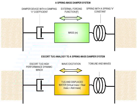 To accurately define the maximum winch capacity of an escort tug, it is necessary to know its escort towing capability, and then, the final requirements of winch performance can be established accordingly [,]. This subject goes beyond the content of this paper; suffice it to say that empirical formulas based on model tests are used where the tug is seen as a spring–mass damper system (Figure 15). The mass is the virtual mass of the tug and the spring is the towline and waves, although the dampening constants of the model to match the wave size and speed are difficult to scale as the behavior of the wave differs with its size, so a margin of error becomes inevitable. Additionally, to achieve specific tailored design requirements to see how much power is needed in the winch, numerical modeling after model or full-scale testing permits to carry out multiple analyses, leading to a more detailed design by considering the behavior of the tug in dynamic environments. This can lead to a more accurate prediction of their performance in these conditions [,].
