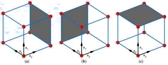 On the other hand, a crystallographic plane in a symmetrical lattice can be defined using the Miller indices in crystal Bravais lattices. Miller indices are defined by the planes intercepting along the unit cell axes. As shown in Figure 1, for example, the cubic cell has three crystallographic planes which can be numbered using Miller Indices Bravais system as (100), (010), and (001) [].