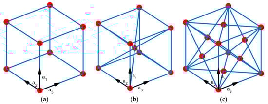 Bravais cubic lattices (a) cubic/primitive, (b) body-centered cubic (BCC), and (c) face-centered cubic (FCC).