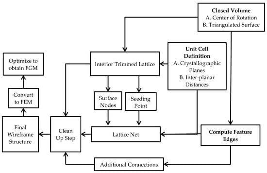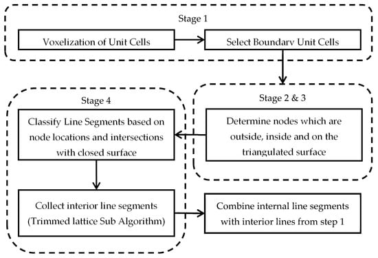 This section presents an algorithm for generating an interior wireframe structure of a trimmed lattice. The methodology implements the work of Tang et al. [] but replaces a functional volume (FV) with a closed surface that is composed of triangles such as the CAD geometry presented in StereoLithography (StL) files [], as shown in Figure 4; the algorithm includes four stages.