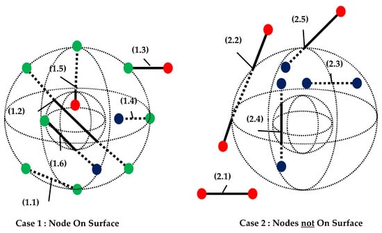 The third stage determines which nodes lay on the surface of the triangulated mesh. This stage is used for collecting information for classifying line segments in the fourth stage. Each node is projected onto the plane of each triangle and barycentric coordinates are used to check if the projected nodes lay within the triangles [,]. The criteria to determine if a node is within a triangle in three dimensions are