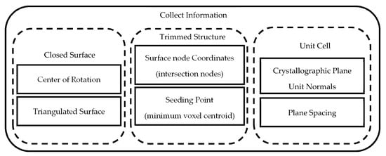 Before initializing the lattice net generation algorithm, the center of rotation (for the triangulated surface), surface node coordinates (intersection between the truncated struts and the triangulated surface), and a seeding point are required. The seeding point is the minimum coordinates for a unit cell or voxel centroid. The seeding point is used to orient and correctly space the contours along the triangulated surface. The center of rotation is used for plane-surface contour collection which rotates the triangulated surface so its z-axis is equivalent to the plane normal direction of the unit cells crystallographic planes. In addition, information about the unit cell crystallographic planes is required and includes the inter-planar spacing between common planes and their associated unit normal. Figure 6 displays and categorizes the necessary input required for the lattice net algorithm.