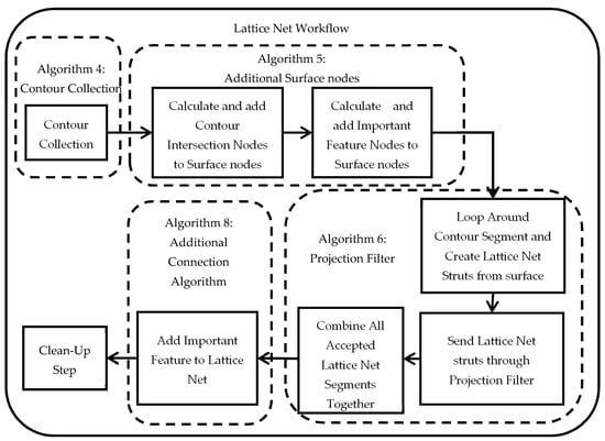 The lattice net generation algorithm contains five stages, as shown in Figure 7: a contour collection stage, additional nodes from contour intersection and “important features” collections stage, then the lattice net generations stage which includes a projection filter, then a feature preservation stage followed by a final clean-up stage. A feature is a sharp angle on the triangulated surface to be retained in the lattice net during the contour collection stage. After generating the lattice net, a postprocessing step is applied to remove any duplicate line segments. The final cleanup step, which collapses beams with less than three connections, is done to simplify the wireframe structure. A pseudocode is developed for the whole process and can be found in Appendix A.7.