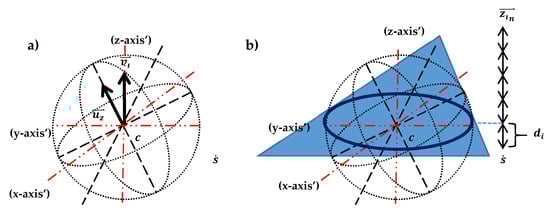 The first step collects the contours for all possible planes along the triangulated surface. The rotation center is used to rotate the triangulated surface so that the z-axis matches the normal of a particular crystallographic plane as illustrated in Figure 8. A rotation matrix is calculated for each crystallographic plane normal and can be defined as [,]