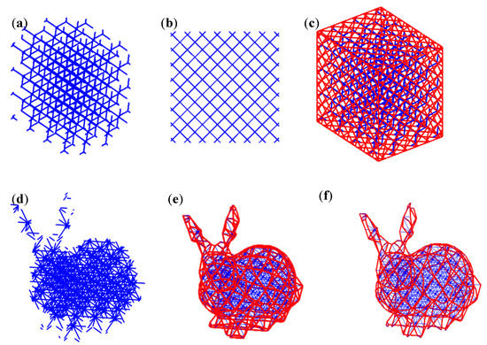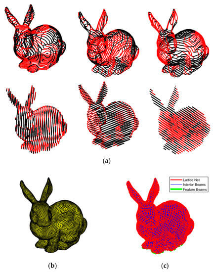 Figure 13f displays a lattice net around the Stanford bunny model using only three crystallographic planes and no filter to connect an interior octet-truss lattice shown in Figure 13d. The resulting net is very similar to Figure 13e which had used all family planes from {111} and the projection filter. This shows the possibility to omit the filter and select a few planes of symmetry to connect all the cut struts together of a trimmed lattice.