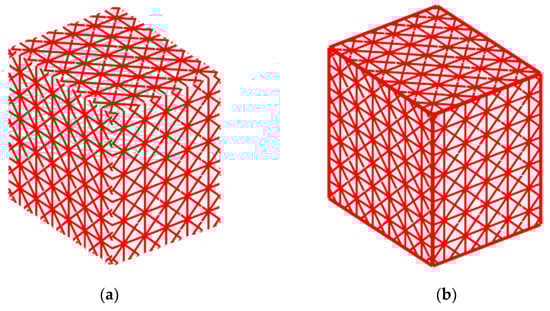 After the initial construction of the lattice net, unit cells could be projected onto sharp corners or features. If the unit cell size does not precisely match the dimensions of the sharp geometries, a discontinuity between the struts will occur at the sharp feature. This occurs when the corner of a unit cell is not placed directly at a vertex. Figure 11a shows a cube without any additional connections at the edges, while Figure 11b shows the addition of the important features into the lattice net. The added features allow structural loads to be transferred uniformly throughout the net eliminating discontinuities and improving the mechanical behavior of the lattice structure.