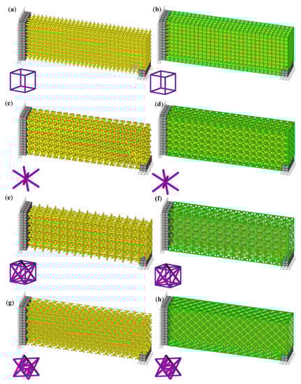 Due to the complexity of the micro-structure of truss lattice materials, where it involves a huge number of elements, the possibility of solving all underlying equations in full detail is computationally expensive and might be impossible. Accordingly, the laws of greatest importance are the principles of symmetry where the lattice is modeled through a unit cell. Such concept in continuum mechanics finds its roots in solid-state physics where a lattice is mainly concerned with replicating the strengths from atomic bonds commonly seen in metals and metallic alloys. Examples of atomic bonds and their strengths can be seen in diamonds where carbon atoms share all their valence electrons with other neighboring carbon atoms forming what is called a diamond lattice. The structure of the diamond lattice is known to have the highest tensile strength among all atomic topologies and could be a good candidate for creating strong micro lattice structures [,]. The number of possibilities for lattice topologies is endless. However, only symmetrical lattice structures with clear crystallographic planes are considered in this paper. The most common symmetric lattice topologies which are also analyzed in this paper include unit cells with Cubic and Body-Centered Cubic (BCC), Face-Centered Cubic (FCC), and diamond geometries [].