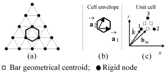 Figure 1 depicts the described concept, with respect to the 2D triangular lattice. Figure 1a shows the microstructure of the LM. The envelope of a possible unit cell is shown with the bold lines in Figure 1a,b. The latter also illustrates the primitive bases and . Figure 1c, on the other hand, depicts the bar arrangement vectors, , and node arrangement vectors, , of the physical structure of the unit cell, where and . b and j are, respectively, the number of bars and nodes within the unit cell.