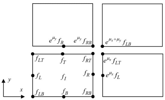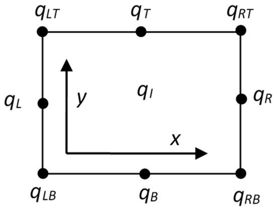 where q is the deformation function of a generic node; T, B, L and R denote top, bottom, left and right, respectively; and are expressed as: