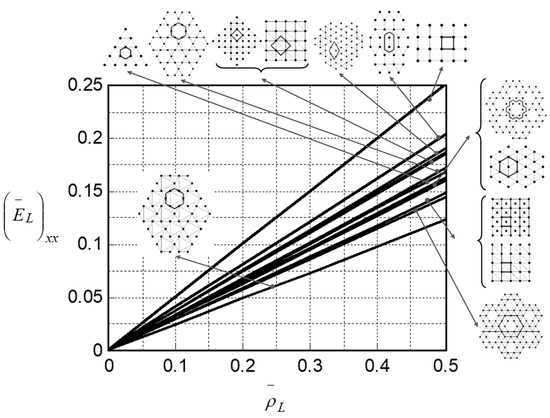 where is a constant parameter that depends on the geometry of the unit cell and H is the in-plane thickness of the microscopic element of the 2D lattice; , and are respectively, the relative density of the LM, the LM density and the density of the solid material. If we consider an out-of-plane depth of the 2D lattice equal to a unit length, L = 1, and substitute Equation (34) into Equations (32) and (33) we obtain: