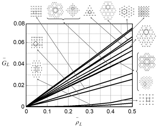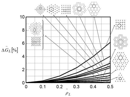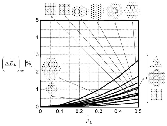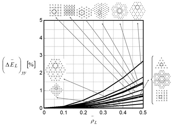 Equations (45)–(47) are plotted in Figure 7, Figure 8 and Figure 9 for all lattice topologies considered. The curves show that the closer the topology to the full triangulated lattice, the less the participation of the micro-bending stiffness to the homogenized macro-stiffness of the LM. It is found that, at relative density 0.3, the microscopic bending contribution is almost 1% in the direct stiffness of the Kagome lattice and 2.2% in the shear stiffness of the Semi-Uni-Braced square lattice. These values can theoretically increase respectively to 8% and 17% for higher relative density, e.g., 0.9. However, for higher density the lattice cells overlap and merge together; thus, the results lose physical significance.