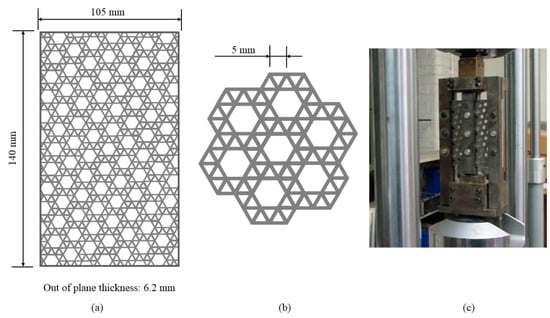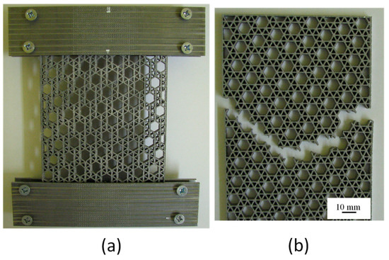 The LM test specimen was designed according to ElSayed and Pasini [27], in order to predict the elastic buckling and plastic yielding failure of unit cell elements, based on the solid material properties. The length of each unit cell element is set as 5 mm, such that a safety factor of 2 is adopted. To compute the tensile specimen height and width, the ASTM standards C363-00 is followed. The shear test was executed utilizing the three-rail shear method, considering the ASTM Standards, D 4255/D 4255M-01. Figure 10 depicts the dimensions utilized for the LM specimens and the test specimen installed in the three-rail shear fixture and testing machine for the shear test. Previous executed experiments demonstrated that the boundary stiffening phenomena, due to clamping of the specimen to the three-rail fixture, is minimal for dimensional ratios of specimen length with respect to unit cell size higher than 3 [58,59]. Thus, the specimen width at both sides of the testing rig is defined as 42 mm.