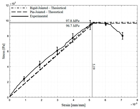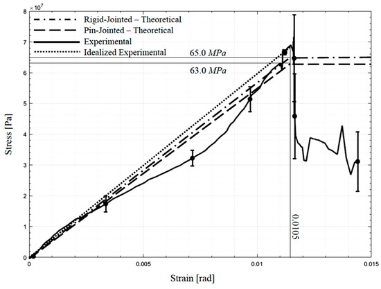 where is the microscopic cell element stress, and is a matrix dependent on the unit cell topology analyzed and on the microscopic cell element deformations. Equation (43) is used to evaluate the strength properties of the lattice topologies by means of the application of three macroscopic stress fields, , considering a single direction in each case. The least resistant element in the lattice unit cell, when subjected to the stress field, will represent the critical macroscopic strength of the lattice material. The relation is given by the following equation: