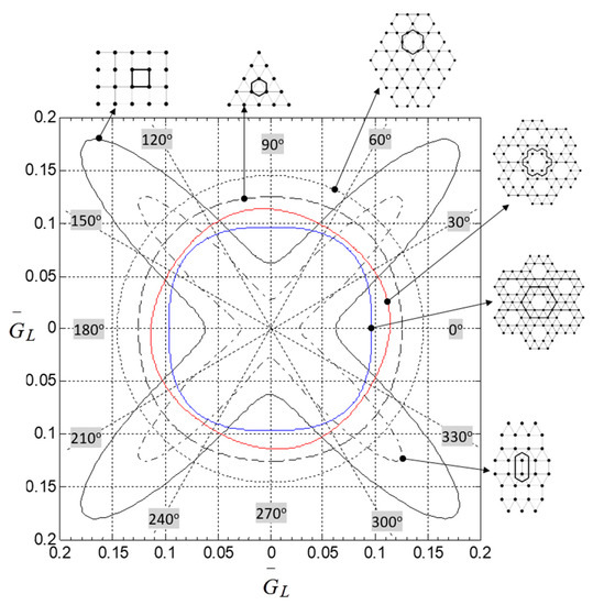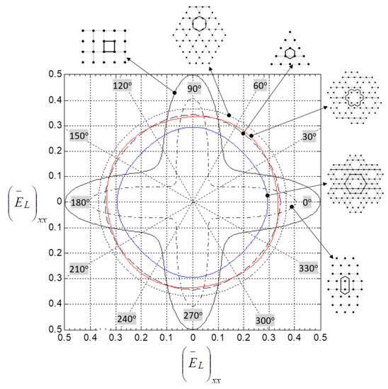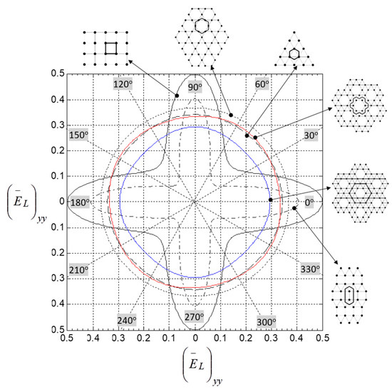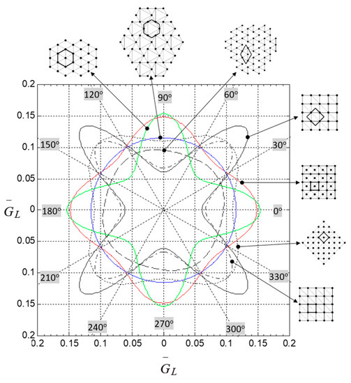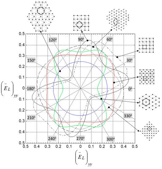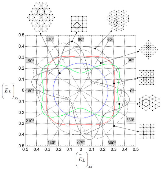 Finally, the third set of plots, Figure 15, Figure 16, Figure 17, Figure 18, Figure 19 and Figure 20, includes polar diagrams showing the magnitude of the elastic moduli in response to a load from any in-plane direction. These charts provide insight into their anisotropic as well as indicate the best orientation a LM can be loaded to withstand a macroscopic loading applied in a given direction. For instance, the fully triangulated lattice is isotropic. Its properties represented by a circle are invariant to the direction of the macroscopic loading. The square lattice, on the other hand, has orthotropic characteristics, as illustrated by the four-point star shape of the moduli. The DHT and topologies exhibit quasi-isotropic stiffness properties as shown by the roughly circular plot of the variation of their elastic moduli correspondent to the direction of macroscopic loading.