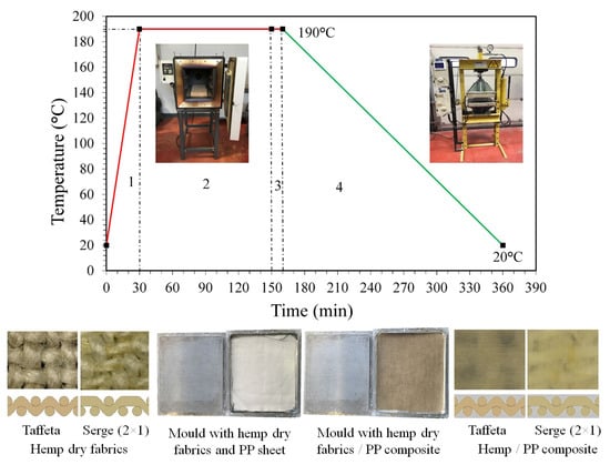 Pure hemp fabrics were supplied by a French local manufacturer in the form of continuous fabric. The fabric is composed of numerous continuous yarns produced by grinding, mechanical carding and spinning of textile hemp stem (length of 4/5 m). Taffeta fabrics (plain weave) and serge 2×1 fabrics (twill weave) with an areal density of 290 g/m and 380 g/m, respectively, were utilized to fabricate the composites. Thin polypropylene (PP) sheet with a density of 0.91 g/cm, melt flow index of 3.2 (230 C/2.16 kg) and thickness 0.8 mm is used in view of its high strength and malleability. Hemp fiber woven fabrics / PP composite sheets were manufactured by conventional thermal compression molding process by the following four steps (Figure 1) according to the thermal curve processing cycle shown in Figure 2.