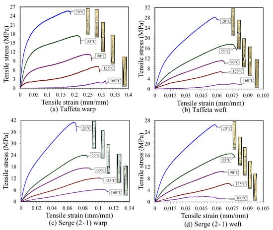 A comparison of uniaxial and biaxial tensile stress versus strain curve for 20 C for taffeta and serge 2×1 woven fabric composite were plotted (Figure 10). The variation in the curve due to the friction-interaction and the weaving type between the fibers is evident. The decrease in the mechanical properties was mainly due to the softening of resin in the composite, which happens during the glass transition period. As the temperature increases, the matrix start melting and interfacial bonding becomes low. As a result, partially separated micro-spaces between fiber and matrix will be formed, which lead to stress propagation []. Moreover, the increase in the temperature creates more viscosity that allows high deformation. Elevation in the temperature increases the ductility of the composite, which results in the reduction of strength and modulus. Necking failure is observed in the low temperature and composites starts elongating as the temperature increment []. Generally, the exposure of thermoplastic composite to high temperature increases the distortion, softens the matrix, and causes thermal degradation, which increases the chance of composite damage.