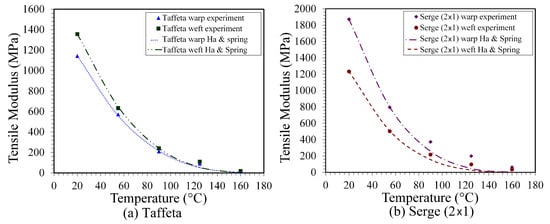 Experimental and predicted tensile modulus versus temperature E(T): (a) taffeta and (b) serge 2×1.