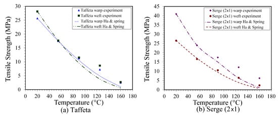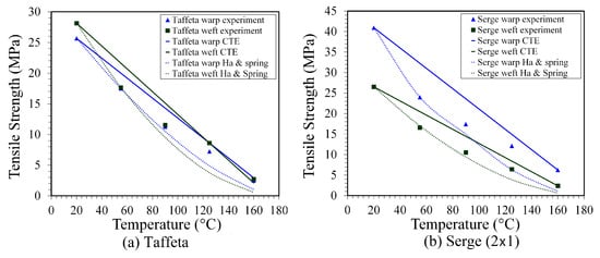 Comparison of experimental and predicted tensile strength by CTE model and Ha & Spring model versus temperature: (a) taffeta and (b) serge 2×1.
